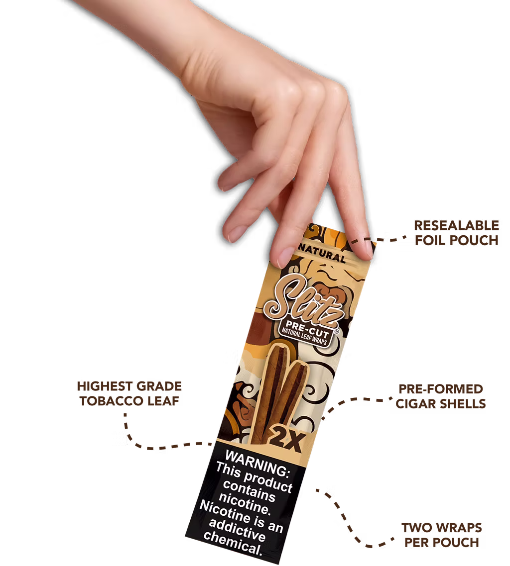 SLITZ™ Pre-Cut Wraps were developed for smokers who prefer Natural Leaf to take their rolling game to the next level. Crafted using only the highest-grade leaf, SLITZ™ Natural Leaf Wraps are designed to deliver a consistent smooth even burn with unmatched convenience.